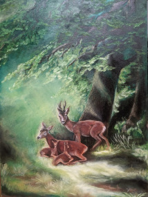 Rehfamilie, Ölfarben auf Karton, 50 X 70